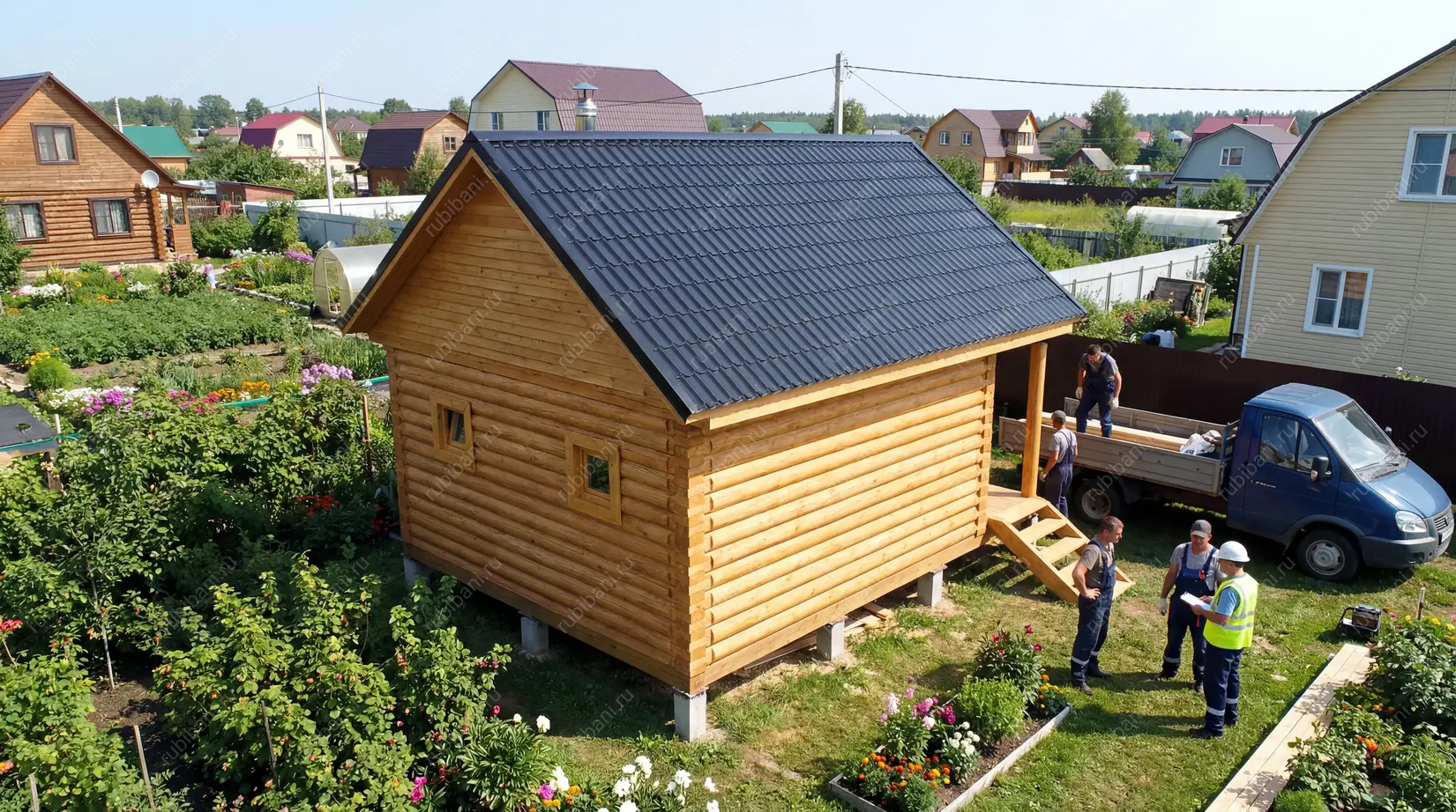 Разгрузка и занос бани к месту строительства до 15 метров — бесплатно. Далее 400 руб за 1 метр заноса.